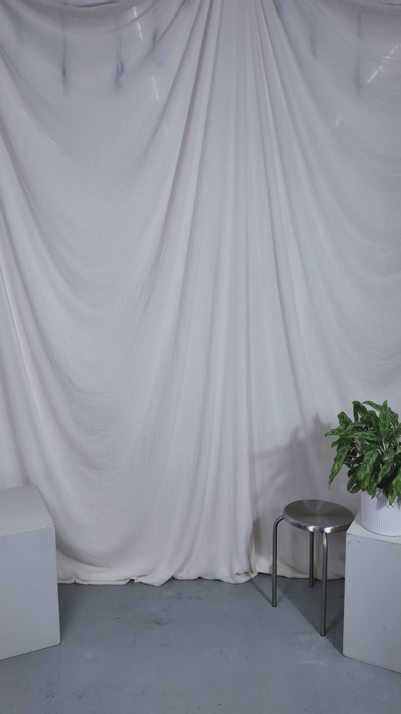 Two people sitting on a stool in a studio setting with photography equipment.